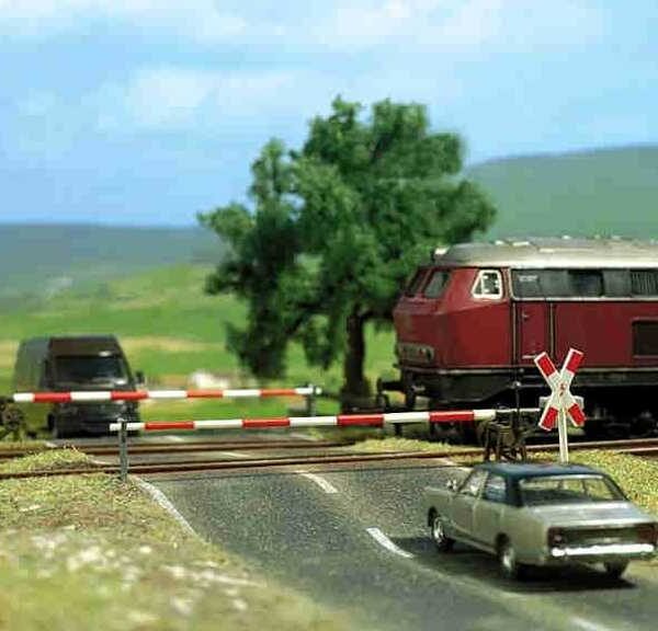 2 Schranken auf Grundplatten montiert (ohne Elektroantrieb), Straßenfüllstücke und Verkehrsschilder.