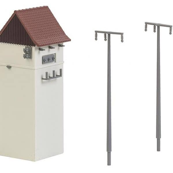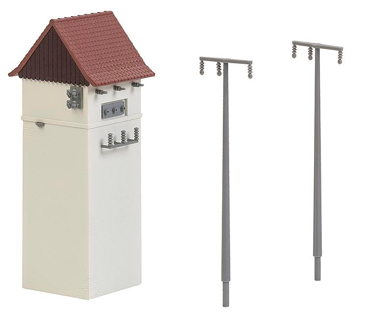 Ländliche Turmstation mit kleiner, quadratischer Grundfläche und einer Holzverschalung am Giebel, Biberschwanzeindeckung und seitlichen Isolatoren für den Anschluss der Freileitungen. Zwei Strommasten liegen dem Bausatz dafür bei.