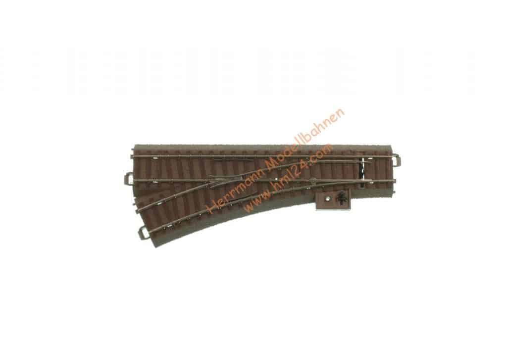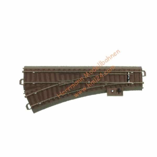 Länge 188,3 mm, Bogen 24,3°, Radius 437,5 mm (R2). Mit Handschalthebel. Elektroantrieb, Weichenlaternen oder Weichendecoder nachrüstbar.