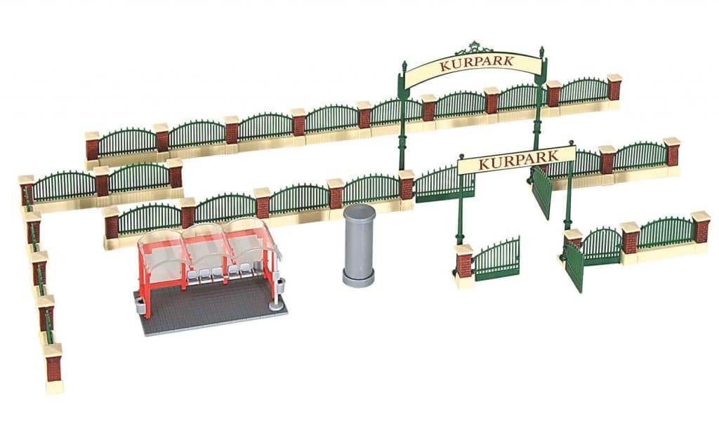 Zu diesem Set gehören außerdem eine überdachte Haltestelle für Bus- oder Straßenbahnen und eine Litfaßsäule.