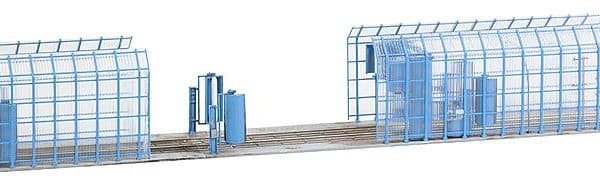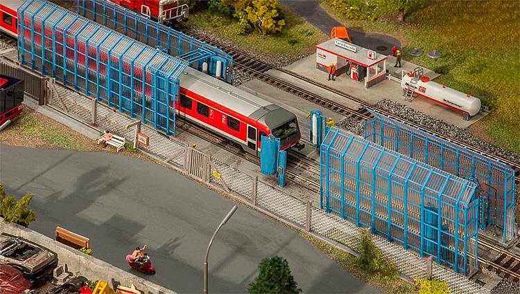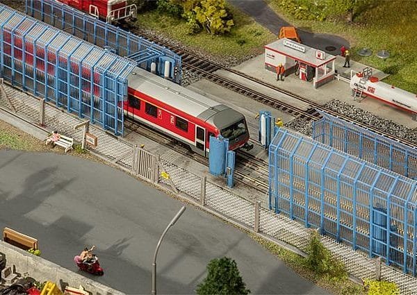 Für Betriebsbahnhof und Depot! Mechanische Zug- und Tramwaschanlage für die Außenreinigung Ihrer Schienenfahrzeuge erspart die Wäsche mit Schrubber und Schlauch. Bei der Durchfahrt erledigen Säulen das Vor- und Nachspülen sowie verschiedene stationäre Seitenwalzen-Paare die Reinigung. Die beiliegende Rahmenkonstruktion ermöglicht die Aufstellung im Freien. Modell ohne Funktion.