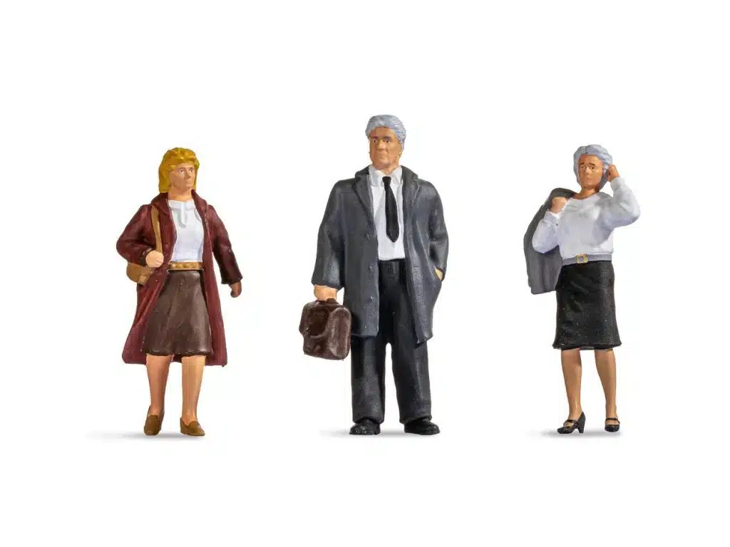 Im Figuren-Set sind 3 Figuren, die alle handbemalt sind, enthalten. Sie alle sind auf Reisen und eine Person hält eine braune Reisetasche in der Hand. Die Figuren sind alle schick gekleidet und warten auf die Weiterreise am Bahnhof.