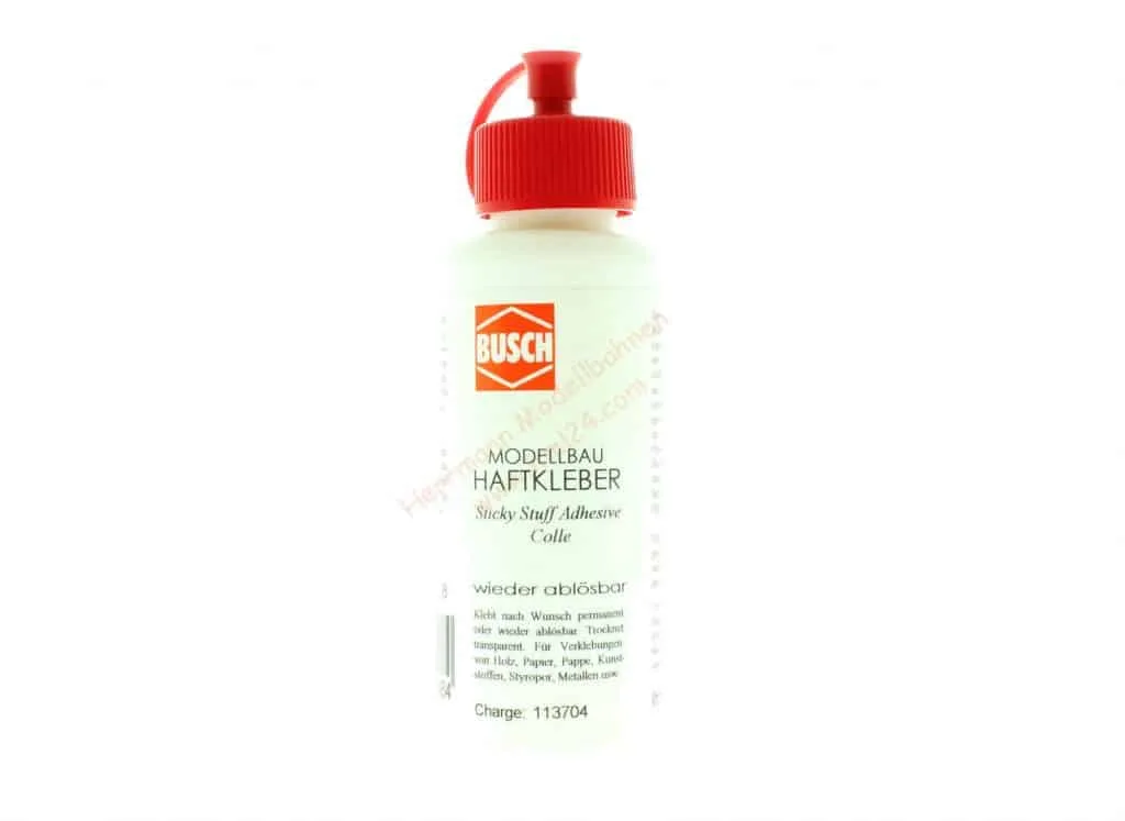 Klebt nach Wunsch permanent oder wiederablösbar. Für Holz, Papier, Pappe, Kunststoffe, Styropor usw. Verklebte Teile können wieder getrennt werden. Besonderheit: Die »Selbstklebe«-Eigenschaft bleibt auch nach mehrmaligem Trennen verklebter Materialien als transparenter Dauer-Haftkleber erhalten. Ideal für die Verklebung von Geländeteppichen, Bäume, Lampen, Signale usw. Außerdem für die Fixierung von Schienen, Gebäuden, Bahnsteigen, Figuren und Landschaftsteilen. Inhalt: 100g.