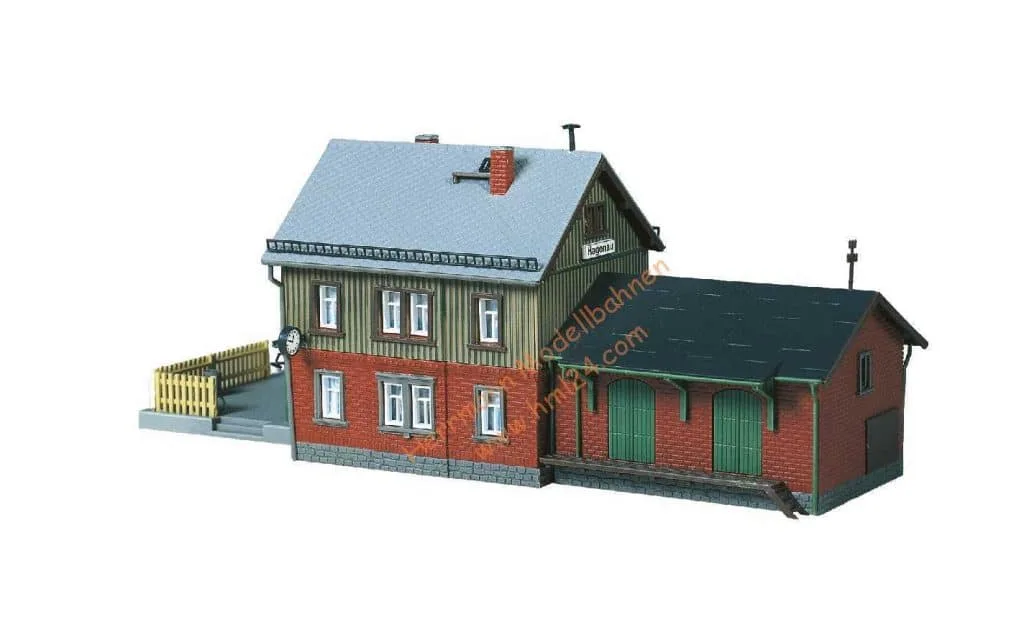 Ein Landbahnhof mit angebautem Güterschuppen. Briefkasten, Müllkübel, Blumenkästen und Fahrrad liegen dem Bausatz bei.