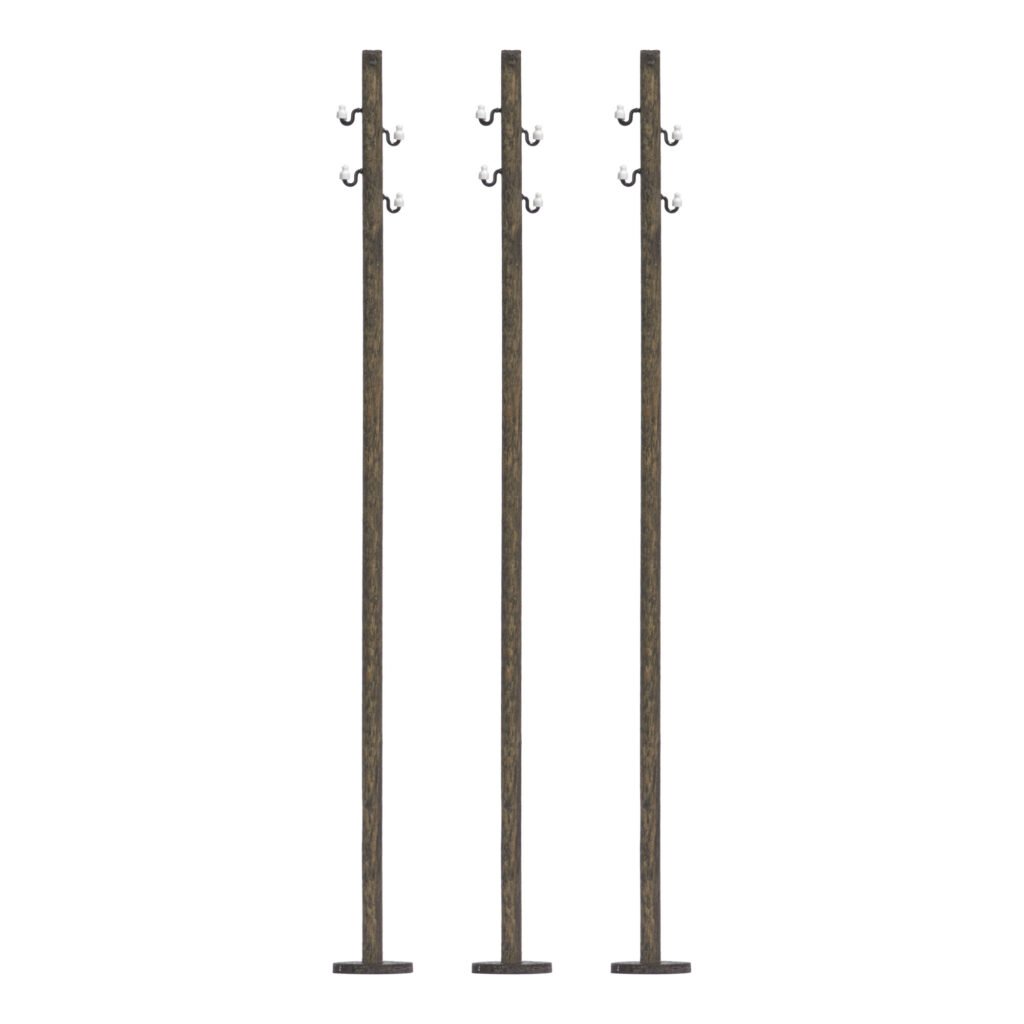 3 gerade Freileitungsmasten aus Echt-Holz mit filigranen Isolatoren. Fertigmodelle.