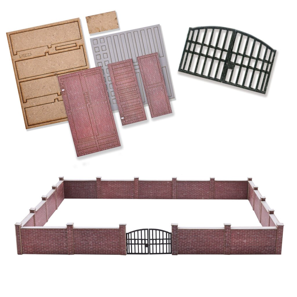 Mit filigranem Gittertor aus Echtholz und stabilen Mauerelementen sowie Säulen aus gelasertem Grafikkarton.